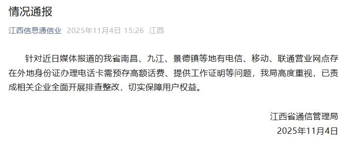 针对近日媒体报道的我省南昌、九江、景德镇等地有电信、移动、联通营业网点存在外地身份证办理电话卡需预存高额话费、提供工作证明等问题,我局高度重视,已责成相关企业全面开展排查整改,切实保障用户权益。